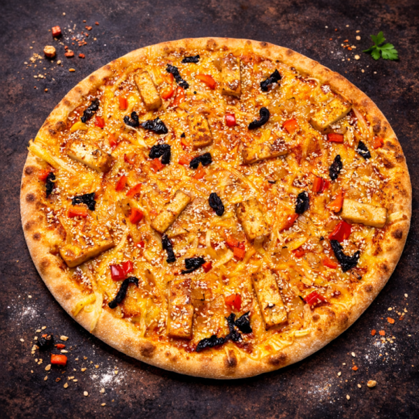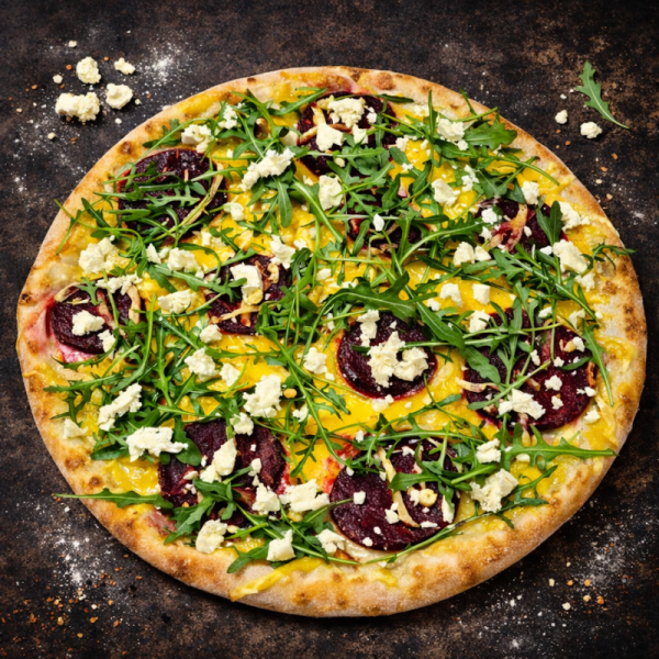 VEGAN PIZZA se sladkou pečenou řepou na vegan smetanovém základě posypaná čerstvou rukolou a vegan řeckým sýrem